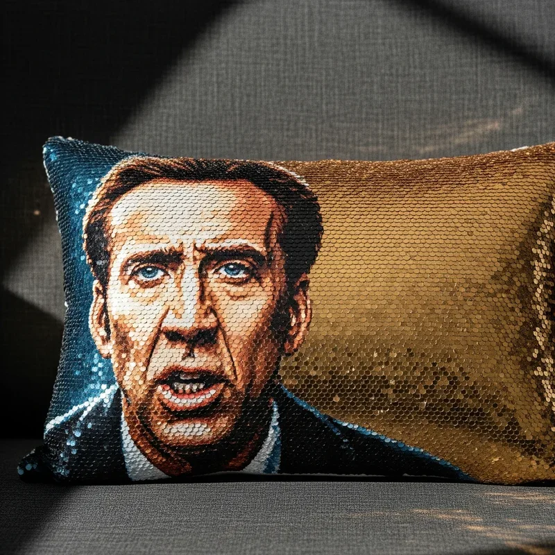 Experience the magic of transformation with this reversible sequin pillow that reveals Nicolas Cage's face when you run your hand across it, creating an unexpectedly mesmerizing home decor piece. The pillow features special two-tone sequins that flip between a solid color on one side and a detailed image of the iconic actor's face on the other. It's become a cult favorite among movie buffs and meme enthusiasts who appreciate the absurdist humor of having Cage's intense expression suddenly appear on their couch. The tactile satisfaction of flipping the sequins combined with the surprise element makes it endlessly entertaining for guests who can't resist playing with it. You can find versions featuring different Cage expressions, from his calm smile to his more infamous intense faces from various movie scenes. The pillow is surprisingly well-constructed with quality sequins that don't easily fall off and a comfortable insert that makes it functional as well as funny.