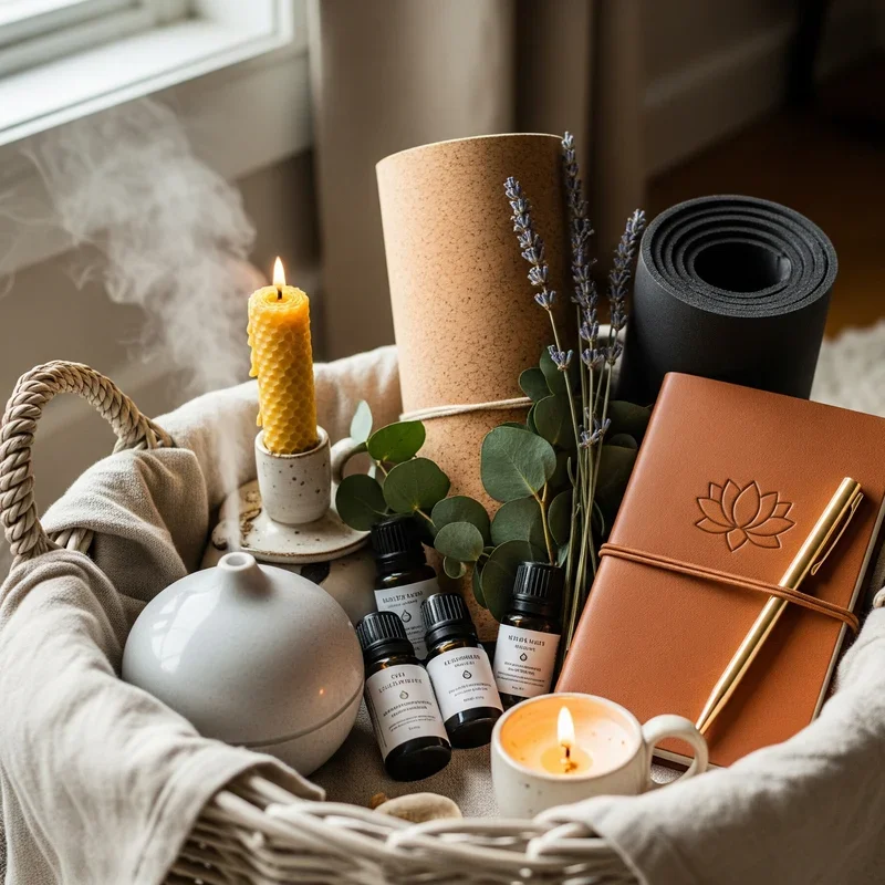 Support her mental wellness journey with this calming basket designed to promote mindfulness, reduce stress, and encourage daily meditation practice. Include a meditation cushion, singing bowl with mallet, mala beads, and guided meditation cards for various intentions and moods. Add aromatherapy items like essential oil rollers, incense, and a Himalayan salt lamp to create a peaceful atmosphere. Pack in mindfulness journals, affirmation cards, stress-relief coloring books, and calming herbal teas. Consider including a white noise machine, yoga blocks, breathing exercise guides, and a subscription to a meditation app. This thoughtful collection helps her cultivate inner peace and maintain emotional balance in our fast-paced world.